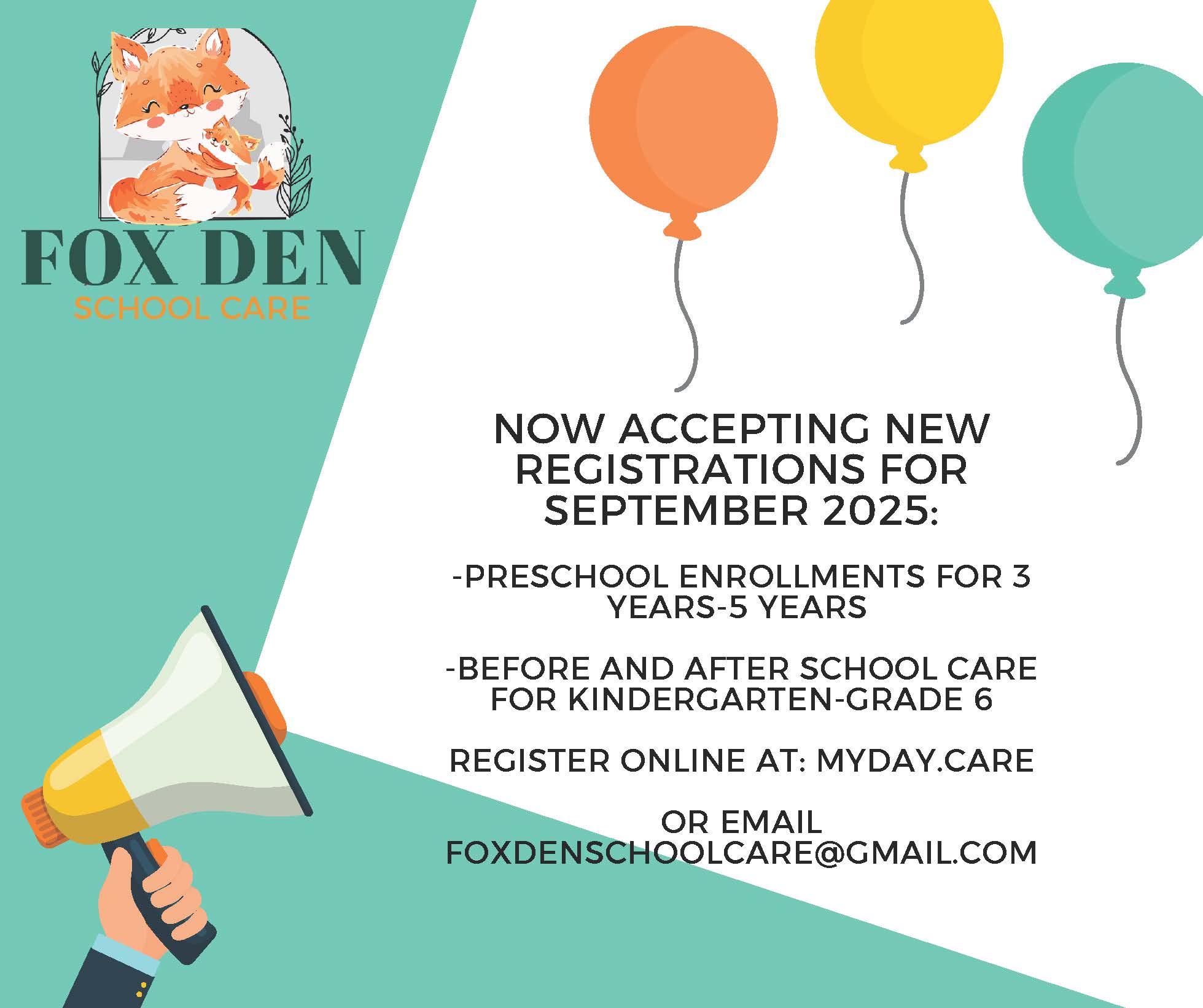 Fox Den School Care FOX DEN SCHOOL CARE Denise2025-08-08T16:06:34-06:00August 8, 2025|Community Matters, News and Announcements| Share This! FacebookXRedditLinkedInWhatsAppTumblrPinterestVkXingEmail
