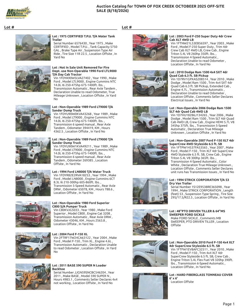 The Town of Fox Creek will be disposing of surplus assets through Michener Allen Auctioneering Ltd. The auction sale will run from October 16 – 18, 2025. But you can sign up to start bidding now.