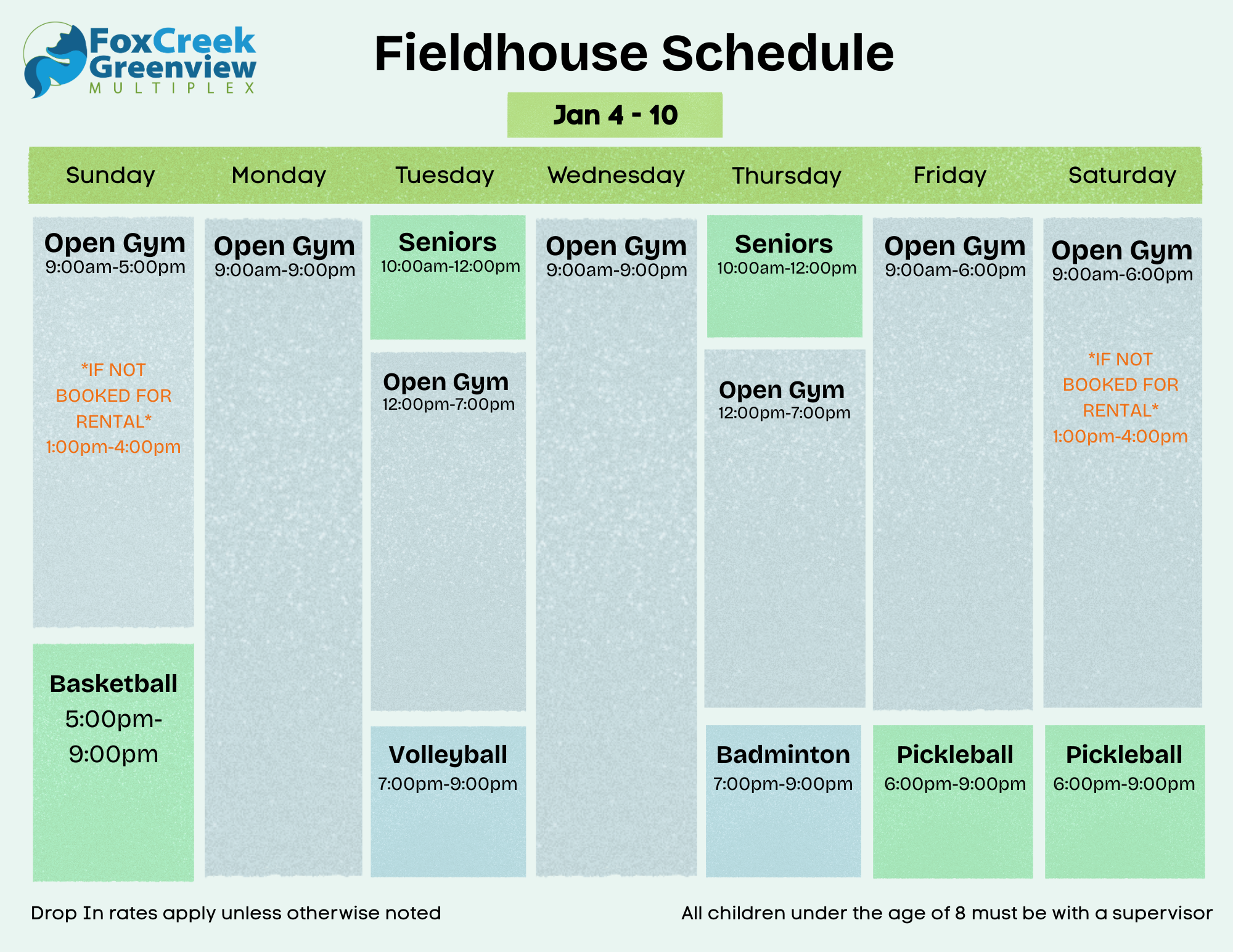 The playing surface is as large as a basketball court. However, if that doesn’t suit your fancy, we have multiple court markings from the standard volleyball, badminton, floor hockey to new games like Pickle Ball.